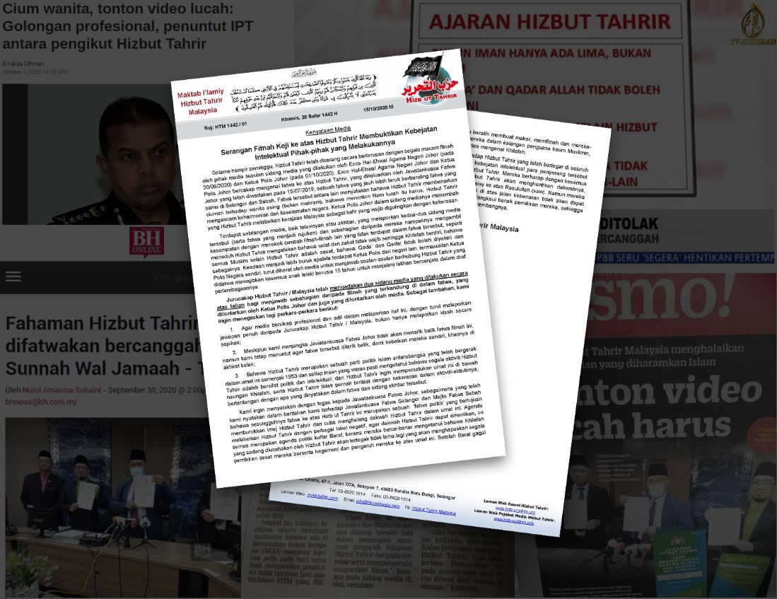 Selama hampir seminggu, Hizbut Tahrir telah diserang secara berterusan dengan segala macam fitnah oleh pihak media susulan sidang media yang dilakukan oleh Exco Hal-Ehwal Agama Negeri Johor (pada 30/09/2020) dan Ketua Polis Johor (pada 01/10/2020). Exco Hal-Ehwal Agama Negeri Johor dan Ketua Polis Johor bercakap mengenai fatwa ke atas Hizbut Tahrir, yang dikeluarkan oleh Jawatankuasa Fatwa Johor yang telah diwartakan pada 15/07/2019, sebuah fatwa yang jauh lebih teruk berbanding fatwa yang sama di Selangor dan Sabah. Fatwa tersebut antara lain menyatakan bahawa Hizbut Tahrir membenarkan ciuman terhadap wanita asing (bukan mahram), bahawa menonton filem lucah itu harus, Hizbut Tahrir mengancam keharmonian dan keselamatan negara. Ketua Polis Johor dalam sidang medianya menambah yang Hizbut Tahrir melabelkan kerajaan Malaysia sebagai kafir yang wajib digulingkan dengan kekerasan.