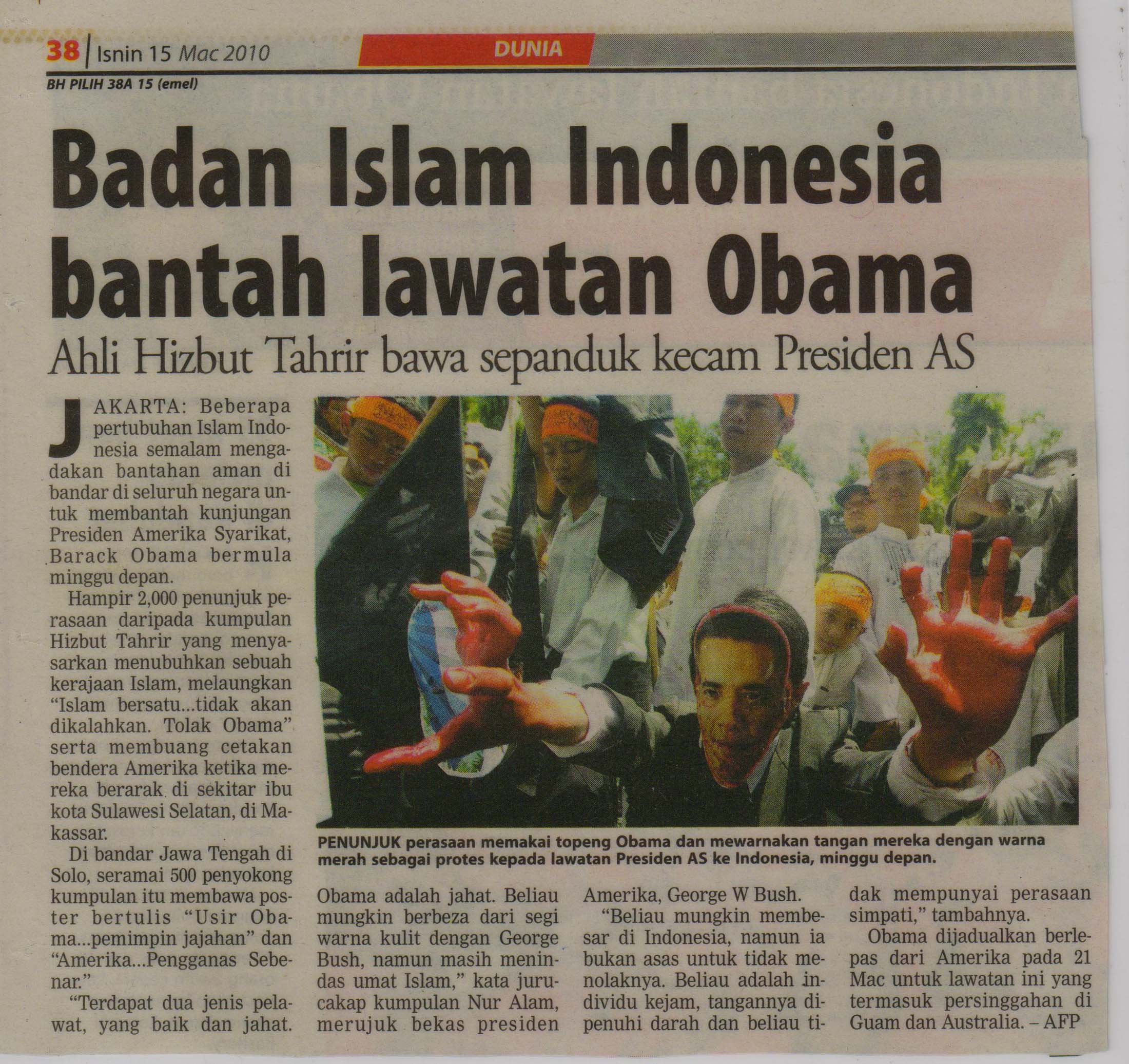 Badan Islam Indonesia Bantah Lawatan Obama Pada Feb 5, 2011 Kongsi Baca Juga: Berita Harian 15 Mac 2010 – Rakyat Indonesia Bantah Obama Rakyat Indonesia bantah Obama SN383 – LAWATAN OBAMA KE MALAYSIA: MENGUKUHKAN PENJAJAHAN DAN MENCEMARKAN ISLAM HTM terus bantah kedatangan Obama dan campurtangannya ke atas dunia Islam Kongsi FacebookTwitterGoogle+WhatsAppEmail