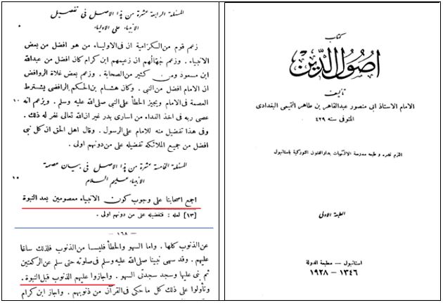 Para ulama bersetuju bahawa para Nabi maksum selepas kenabian mereka…dan mungkin sahaja bagi mereka untuk melakukan dosa sebelum kenabian mereka…[Al-Imam Abu Mansur Abdul Qahir al-Baghdadiy, Ushuluddin, hal 167-168]