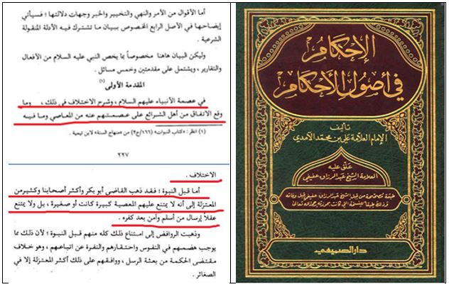 Syiah Imamiyah silap dalam menentukan kemaksuman para Nabi sehingga mereka melarang adanya sebarang perlakuan dosa dari para Nabi sebelum dan selepas kenabian…Kebanyakan golongan Muktazilah bersetuju dengan Syiah dalam mazhab mereka kecuali dalam perkara dosa kecil yang tidak melampau, sebelum dan selepas kenabian…Golongan Mutakallimun seperti al-Amidi, ar-Razi dan al-Baqilani dan sebahagian Muktazilah mengatakan bahawa para Nabi boleh melakukan dosa besar dan kecil sebelum kenabian [Muhammad Sulaiman al-Asqar, Af’al ar-Rasul wa Dalalatuha fi Ahkam asy-Syariah, hal. 144].
