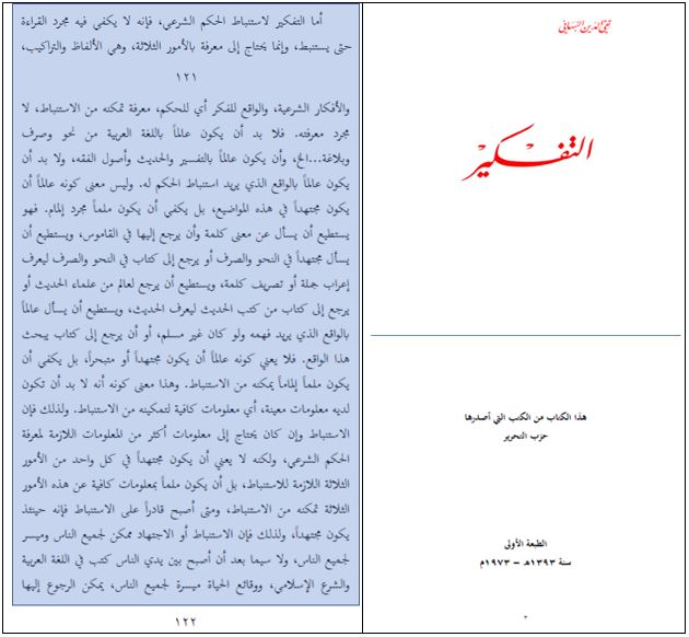 Mengenai berfikir untuk menggali hukum syarak, sebenarnya tidak cukup hanya dengan membaca kemudian boleh melakukan penggalian hukum. Tetapi, berfikir tersebut memerlukan pengetahuan tentang tiga perkara , iaitu lafadz (al-alfadz) dan susunan lafadz (at-tarakib), pemikiran syarie dan fakta pemikiran atau hukum, dengan kadar pengetahuan yang memungkinkannya untuk melakukan penggalian hukum, bukan sekadar mengetahuinya sahaja. Hal ini kerana, dia mestilah ‘alim tentang bahasa Arab, seperti ilmu nahu, sharaf, balaghah dan sebagainya. Dia juga harus ‘alim tentang tafsir, hadis dan ushul fikih. Dia juga harus ‘alim tentang fakta yang hukumnya hendak digali. Konotasi dia harus ‘alim tidak bererti dia harus sampai pada tahap mujtahid dalam topik-topik ini. Tetapi, cukuplah pada tahap menguasai dengan penguasaan yang sempurna. Ini kerana, dia boleh bertanya tentang makna kalimat dan boleh merujuknya kepada kamus. Dia boleh bertanya kepada seorang mujtahid di bidang nahu dan sharaf, atau merujuk kepada buku nahu dan sharaf untuk mengetahui i’rab suatu kalimat, atau tashrif suatu kata. Dia juga boleh merujuk kepada salah seorang ulama hadis atau merujuk kepada buku hadis untuk mengetahui hadis tertentu. Dia juga boleh bertanya kepada orang yang mengetahui waqi’ (fakta) yang ingin dia fahami, sekalipun orang tersebut non-Muslim, atau merujuk kepada kitab yang membahas fakta tersebut. Jadi, konotasi dia harus ‘alim tidak bererti dia harus sampai pada tahap mujtahid, atau orang yang mendalam sekali pengetahuannya, melainkan cukuplah pada tahap menguasai dengan penguasaan yang sempurna, yang memungkinkannya untuk melakukan penggalian hukum. Inilah pengertian harus menguasai pengetahuan tertentu, atau pengetahuan yang cukup supaya dia boleh melakukan penggalian hukum. Oleh kerana itu, sekalipun penggalian hukum tersebut memerlukan pengetahuan yang lebih banyak dari sejumlah pengetahuan yang lazim untuk mengetahui hukum syarak, tetapi tidak bererti dia mesti sampai pada tahap mujtahid dalam setiap ketiga perkara yang lazim digunakan untuk menggali hukum. Tetapi, cukup pada tahap menguasai pengetahuan yang cukup tentang ketiga perkara yang memungkinkannya untuk melakukan penggalian hukum. Ketika dia telah mampu melakukan penggalian hukum, maka dia boleh menjadi mujtahid. Oleh kerana itu, penggalian hukum atau ijtihad itu mungkin bagi semua orang, dan sangat mudah bagi semua orang, terutama setelah buku-buku tentang bahasa Arab dan syariat Islam ada di tangan mereka…”
