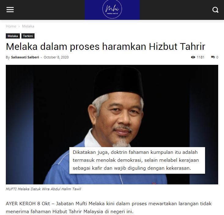Sebagaimana dilaporkan dalam portal online Melaka Hari Ini (https://www.melakahariini.my/melaka-dalam-proses-haramkan-hizbut-tahrir/)