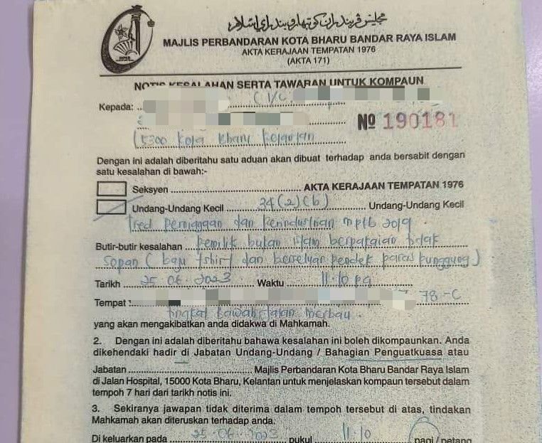 Wanita tersebut dikatakan melanggar Seksyen 34(2)(b) Undang-Undang Kecil Pelesenan Tred, Perniagaan dan Perindustrian (MPKB-BRI) 2019 yang memperuntukkan bahawa pemilik lesen perniagaan mesti memastikan mereka yang bekerja di premis berkenaan berpakaian sopan atau menutup aurat jika mereka beragama Islam.