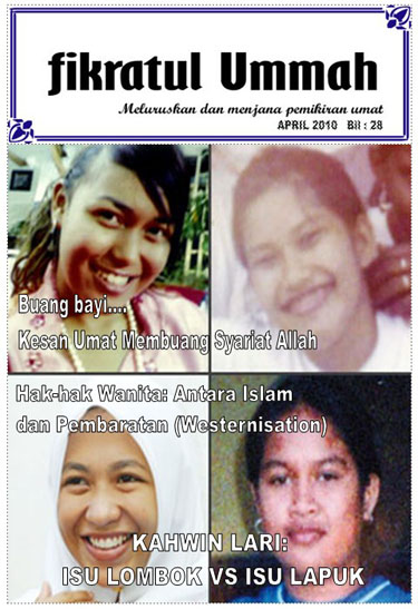 Alhamdulillah, Fikratul Ummah edisi April 2010 menyajikan dua buah artikel iaitu Kahwin Lari: Isu Lombok vs Isu Lapuk dan Buang Bayi kesan Buang Syariat Allah. Disamping dua artikel yang mengupas permasalahan yang sedang hangat diperkatakan di Negara ketika ini, sebuah artikel terjemahan bertajuk Hak-hak Wanita: Antara Islam dan Pembaratan diharap akan dapat mengingatkan kaum Muslimah bahawasanya, puak Kuffar Barat berusaha menjauhkan umat yang mulia ini dari agamanya secara istiqamah, secara konsisten. “Orang-orang Yahudi dan Nasrani tidak akan senang kepada kamu hingga kamu mengikuti agama mereka” [TMQ Al Baqarah (2): 120].
