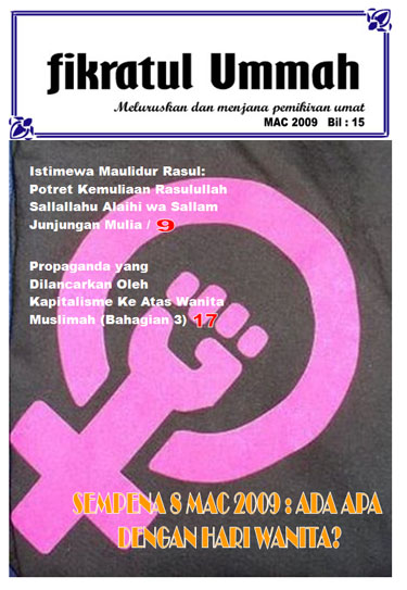 Adalah diharapkan agar artikel-artikel yang dipaparkan pada Fikratul Ummah edisi Mac 2009 ini akan memberikan kefahaman kepada Muslimat khususnya, perancangan keji puak Kuffar-Barat untuk menyesatkan umat Islam melalui solusi dangkal mereka. Selain itu, harapan kami agar Muslimat akan dapat melihat bagaimana keindahan Islam dapat mengangkat darjat dan kemuliaan mereka melalui hukum-hakam terkait dengan kaum Hawa dan juga melalui kecintaan kepada Rasulullah Sallalahu Alahi Wa Sallam yang dibuktikan dengan pemahaman peranan mereka sebagai ummu wa rabatul bait seiring dengan kewajipan melakukan kerja dakwah.