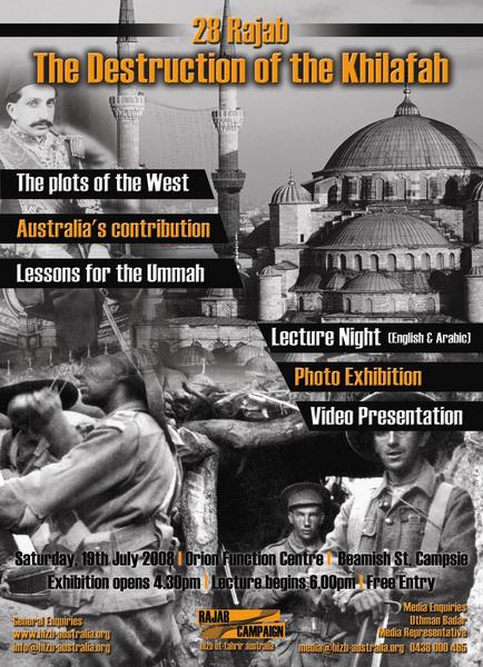 Be on the look out for the brothers from Hizb ut Tahrir Australia as they hit the streets with flyers for the event – a good chance for everyone to discuss the significance of this month and the imperative of re-establishing the Islamic state that was destroyed in this month.