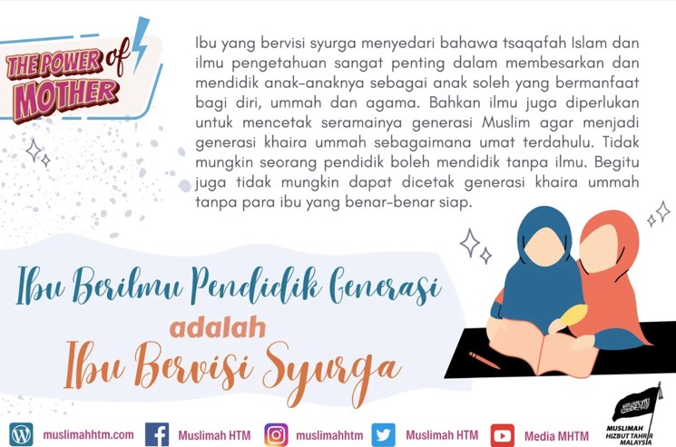 Apabila seorang ibu menjadikan syurga sebagai visinya, sudah pasti semua aktiviti dan tindak tanduknya akan tercermin dari visi tersebut. Sehingga, dia menjalani kehidupan ini dengan motivasi dan dorongan untuk meraih redha Allah SWT. Bagi ibu yang bervisi syurga, pendidikan dan ilmu pengetahuan sangatlah penting untuk mencapai tujuan tersebut. Pendidikan dan ilmu Islam (tsaqafah) merupakan aspek yang sangat penting dalam menuntun cara hidup dan berfikir manusia, agar kehidupannya berlandaskan syariat. Dengan pemahaman ini, ibu tidak akan tertipu oleh model kehidupan acuan ideologi kufur atau fahaman asing yang sudah pasti menggiring manusia jauh dari syurga Allah kelak. Na’uzubillah.
