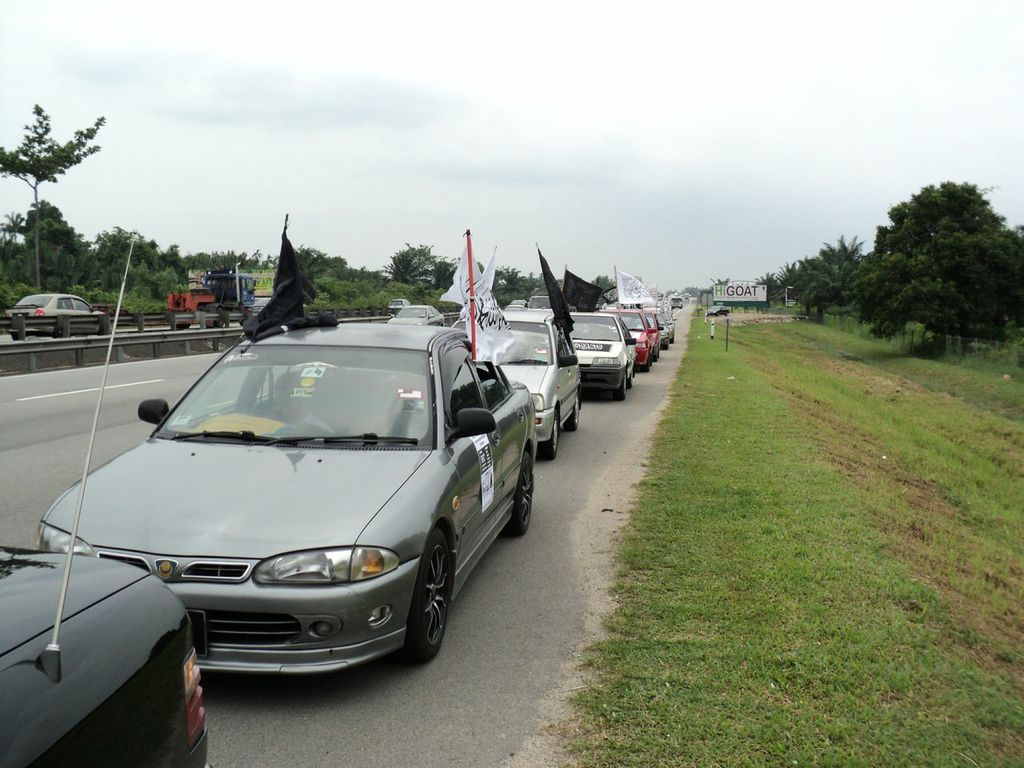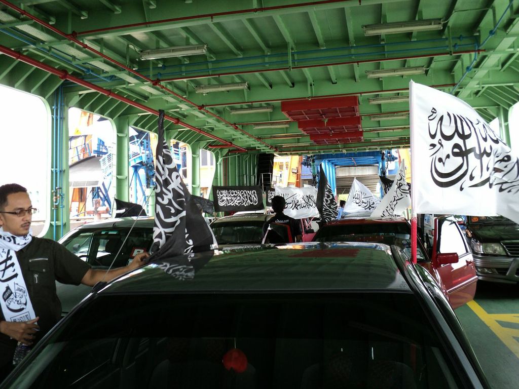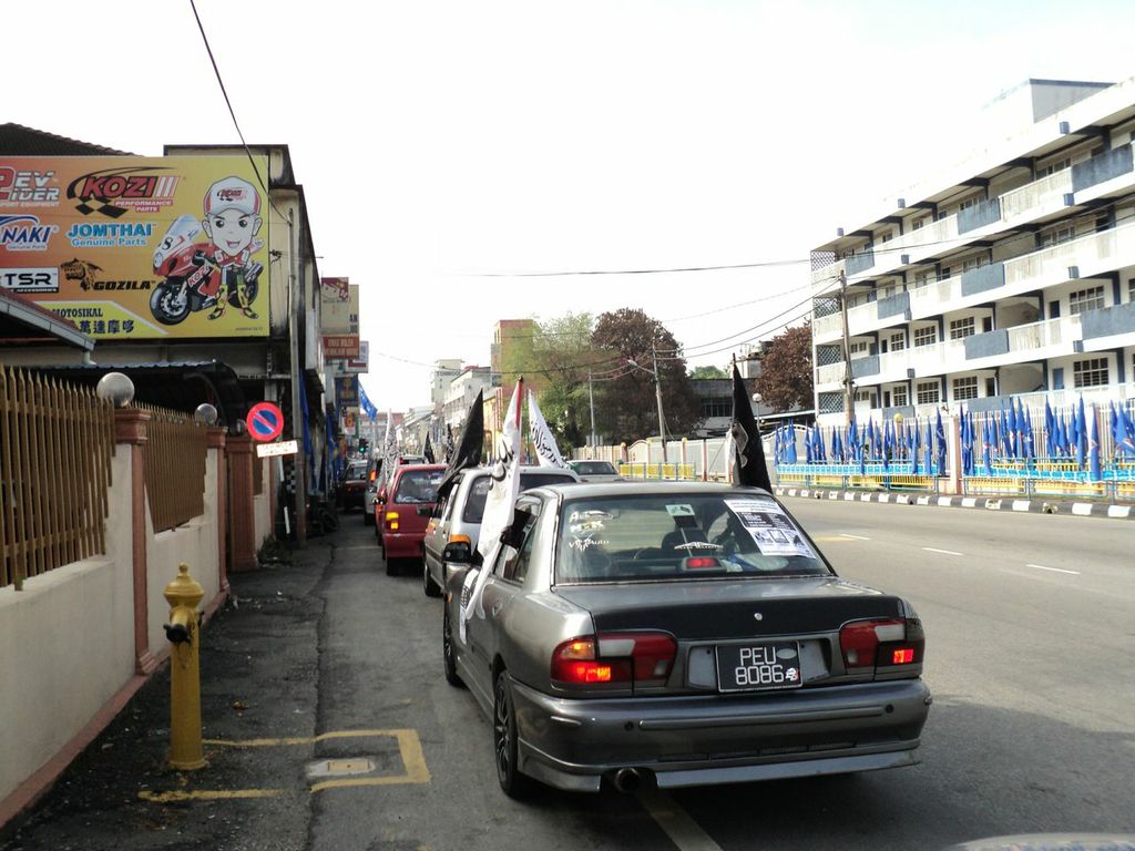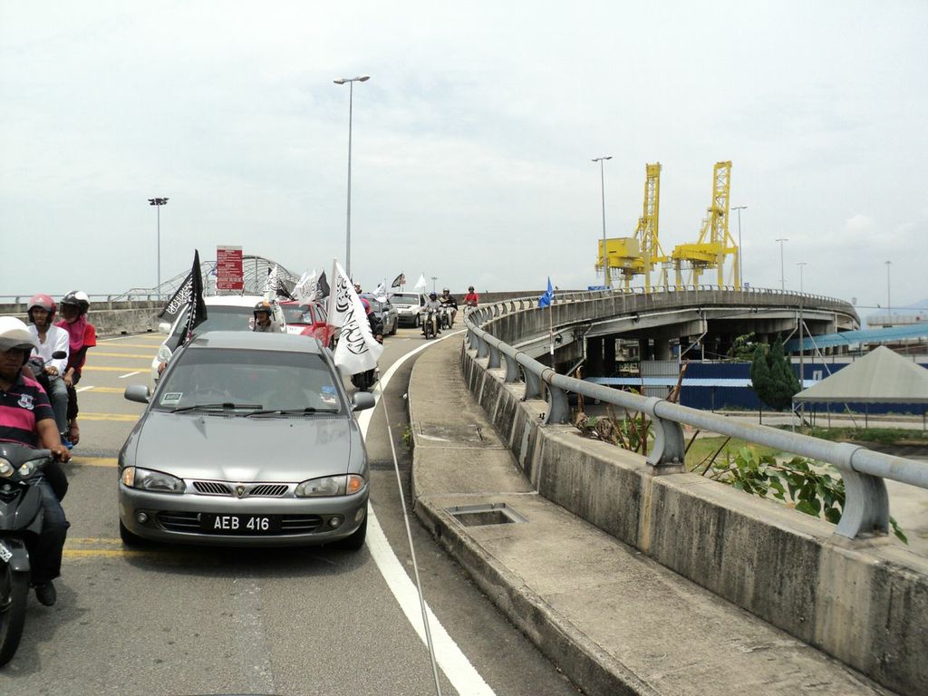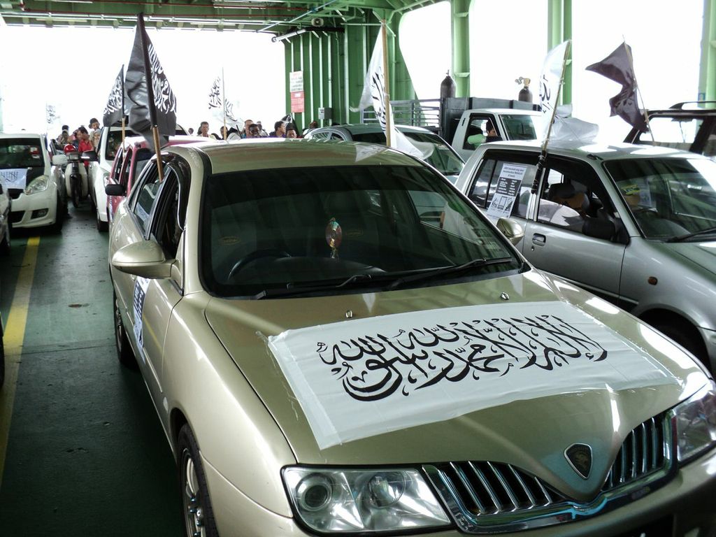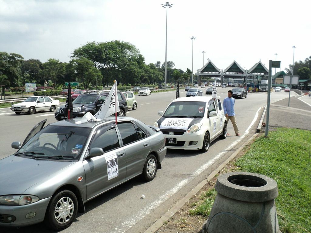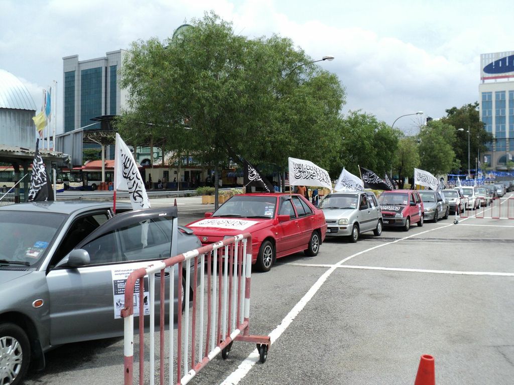 PULAU PINANG, Ahad 5 mei 2013, Konvoi Al-Liwa’ & Ar-Rayah, Sempena PRU ke 13, Hizbut Tahrir kawasan Pulau Pinang telah mengibarkan Al-Liwa’ dan Ar-Rayah bermula di Bandar Baru Perda, Seberang Prai. Konvoi melalui bandar Bukit mertajam, Jalan Kulim, Jalan Alma, Juru Autocity. Perarakan berkereta telah menyeberang ke Pulau Mutiara melalui jambatan Pulau Pinang dan melalui Jalan Bayan Lepas, Jalan Tun Dr Awang, Bandar Bayan  Baru, Batu Uban, Gelugor, Jalan Tun Dr Lim Chong Eu Expressway dan berhenti di Padang Kota Lama pada jam 11 pagi. Kumpulan berkerata ini diteruskan dengan menaiki feri Pulau Pinang untuk kembali ke Seberang Prai dan menyusuri Lebuhraya Lingkaran Luar Butterworth menuju ke Jalan Permatang Pauh, Jalan Permatang Nibong, Jalan Tanah Liat Kubang Semang, singgah di Bandar Bukit Mertajam dan berakhir di Bandar Baru Perda pada Jam 3.00 petang. Alhamdulillah syukur kepada Allah kerana perjalanan agak lancar seperti dirancang.