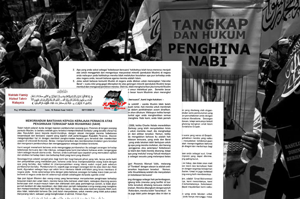 - Kami dan umat Islam di Malaysia mengutuk dengan penuh kemarahan akan kejahatan anda menghina Nabi Muhammad (saw) yang mulia, serta tindak balas tidak masuk akal Presiden anda mengenai perkara tersebut. Kami menegaskan bahawa penghinaan ke atas anak Adam yang terbaik, dan juga makhluk Allah (swt) yang terbaik – Muhammad (saw) – sama sekali tidak dapat diterima dan merupakan tindakan biadab, tidak kira apa pun justifikasinya. Kami dengan tegas menekankan bahawa kesucian umat Islam mesti dihormati dan ini merupakan harga mati.