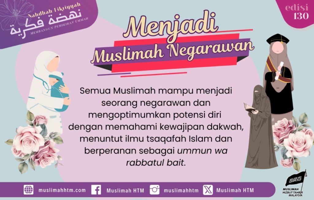 Dalam sejarah tinta emas Islam, terdapat tokoh Muslimah Negarawan hebat yang boleh diteladani. Mereka adalah golongan intelektual peradaban, penggerak dakwah politik dan ibu kepada generasi pemimpin umat yang menyedari kejayaan terbesar mereka adalah dengan berusaha mendidik generasi dan menyiapkan tamadun gemilang.