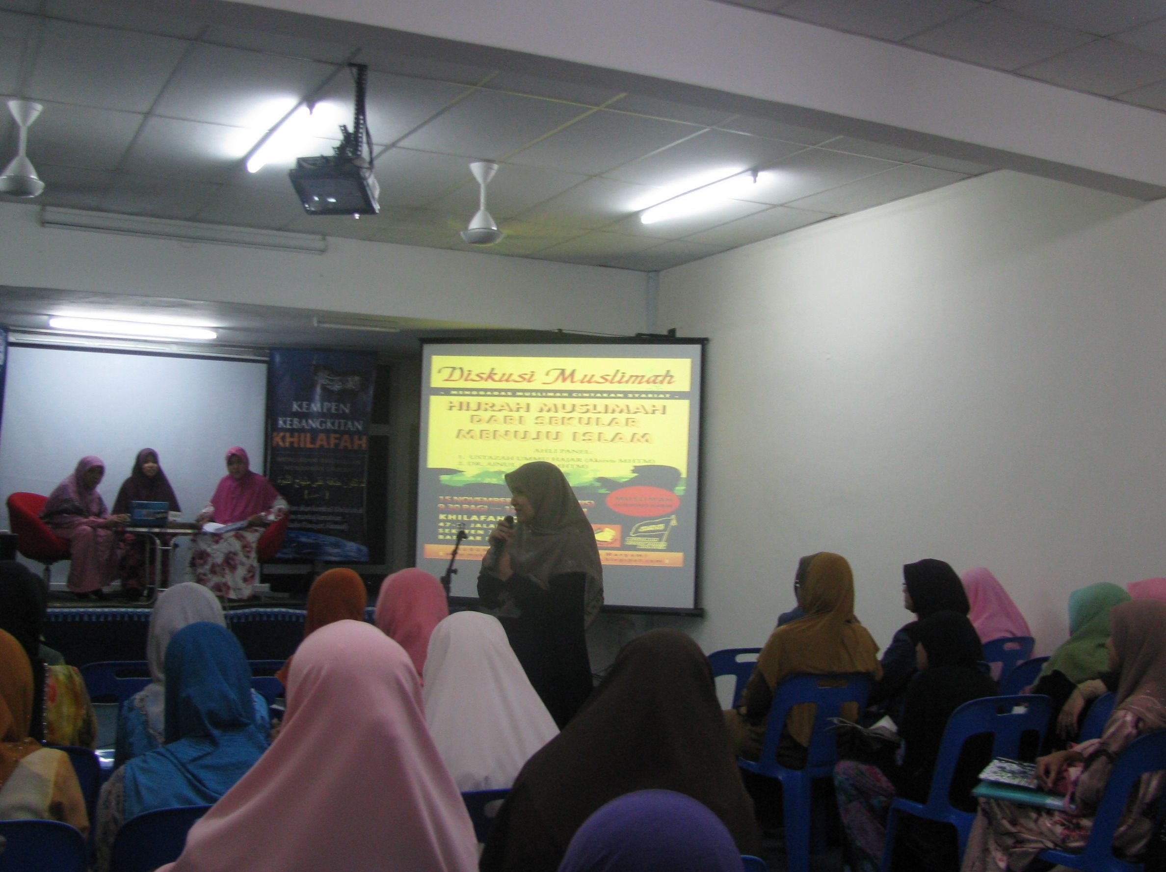 BANDAR BARU BANGI 15 November – Sempena tahun baru Hijrah yang baru sahaja tiba, Muslimah Hizbut Tahrir Malaysia (MHTM) meneruskan siri Diskusi Muslimah dengan memilih tajuk “Hijrah Muslimah: Dari Sekular Menuju Islam”. Diskusi kali ini menampilkan Ustazah Ummu Hajar dan Dr. Ainul selaku ahli panel manakala Puan Sumayyah selaku moderator dibantu oleh Puan Sabariah.