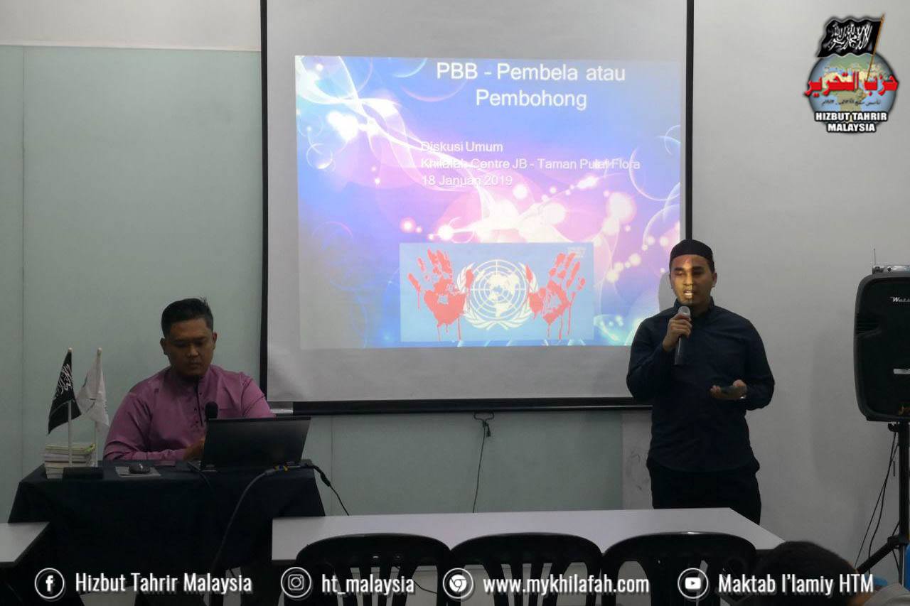 Hal ini dibincangkan semasa sesi Diskusi Umum anjuran Hizbut Tahrir Malaysia cawangan Johor Bahru yang telah disampaikan oleh saudara Dr Amri selaku panel pembentangan. Panel juga menegaskan bahawa kuasa veto milik lima negara ahli tetap PBB iaitu Amerika Syarikat (AS), United Kingdom (UK), Perancis, China dan Russia sebenarnya telah memberi ‘kuasa’ kepada mereka untuk menindas dan menekan sasaran mereka demi meraih kepentingan masing-masing pihak.