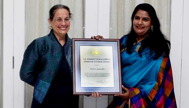Indira Ghandi yang berjaya mencabar keputusan penukaran tiga orang anaknya kepada Islam oleh bekas suaminya telah dicalonkan untuk menerima Anugerah Wanita Berani Antarabangsa minggu lepas. Ia sebagai penghormatan dan pengiktirafan terhadap perjuangan Indira Ghandi selama hampir 10 tahun yang lalu dalam usaha mendapatkan haknya untuk mengenepikan keputusan penukaran agama anaknya.