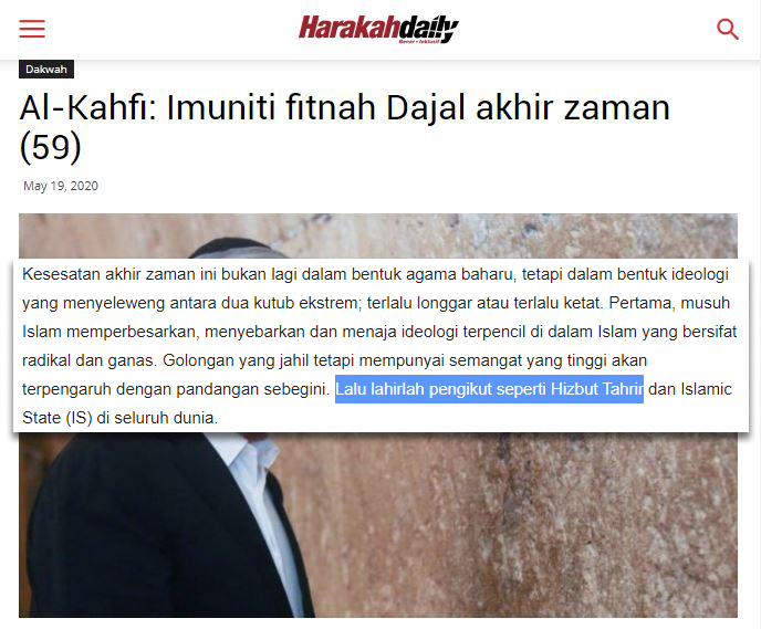 For the first time after becoming part of the ruling parties, the official portal of the Malaysian Islamic Party (PAS), harakahdaily.net has published an article of an author by the name of Alang Ibn Shukrimun, who has defamed Hizb ut Tahrir. The article dated 19/05/2020 entitled “Al-Kahfi: Immunity from the Trials of Dajjal at the End of the World (59)” [Al-Kahfi: Imuniti Fitnah Dajal Akhir Zaman (59)]” began with the author exposing the evil agenda of the Jews and Christians to deviate the Muslims. Then, the author said: